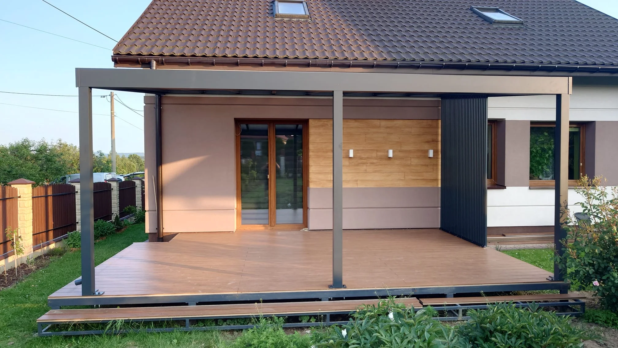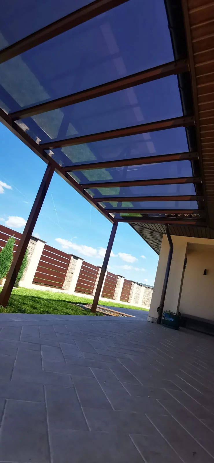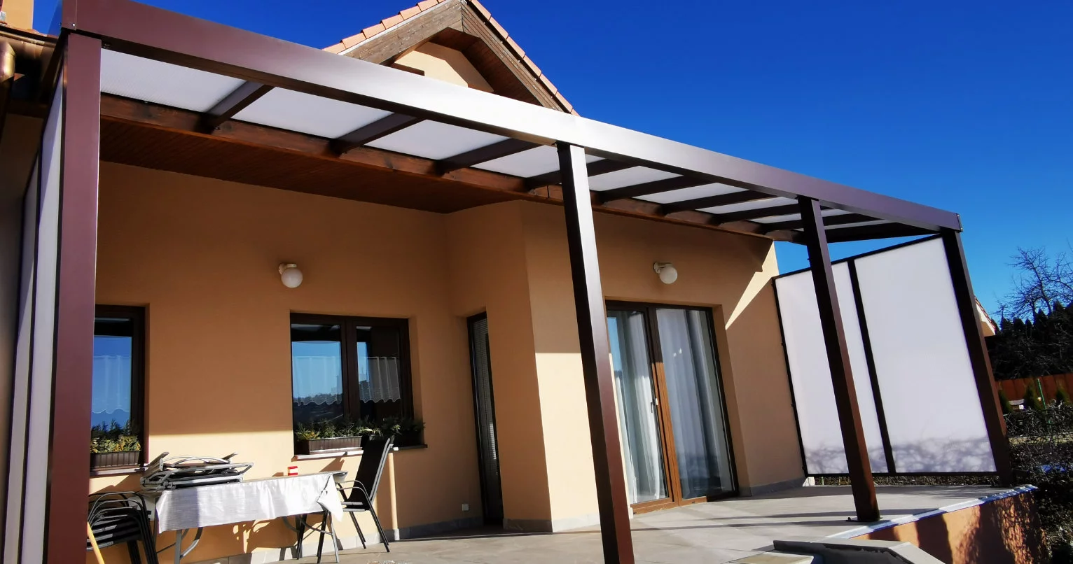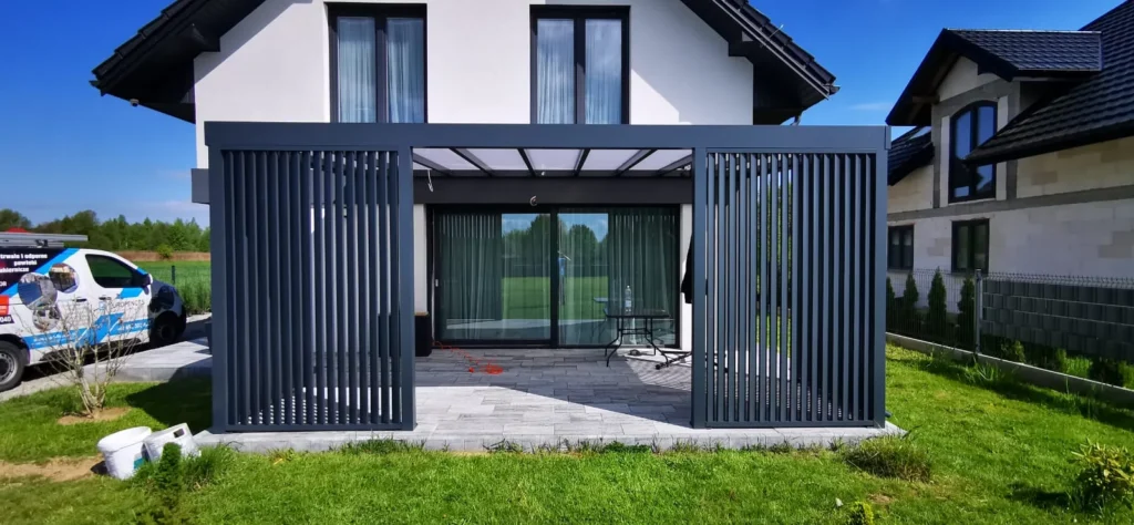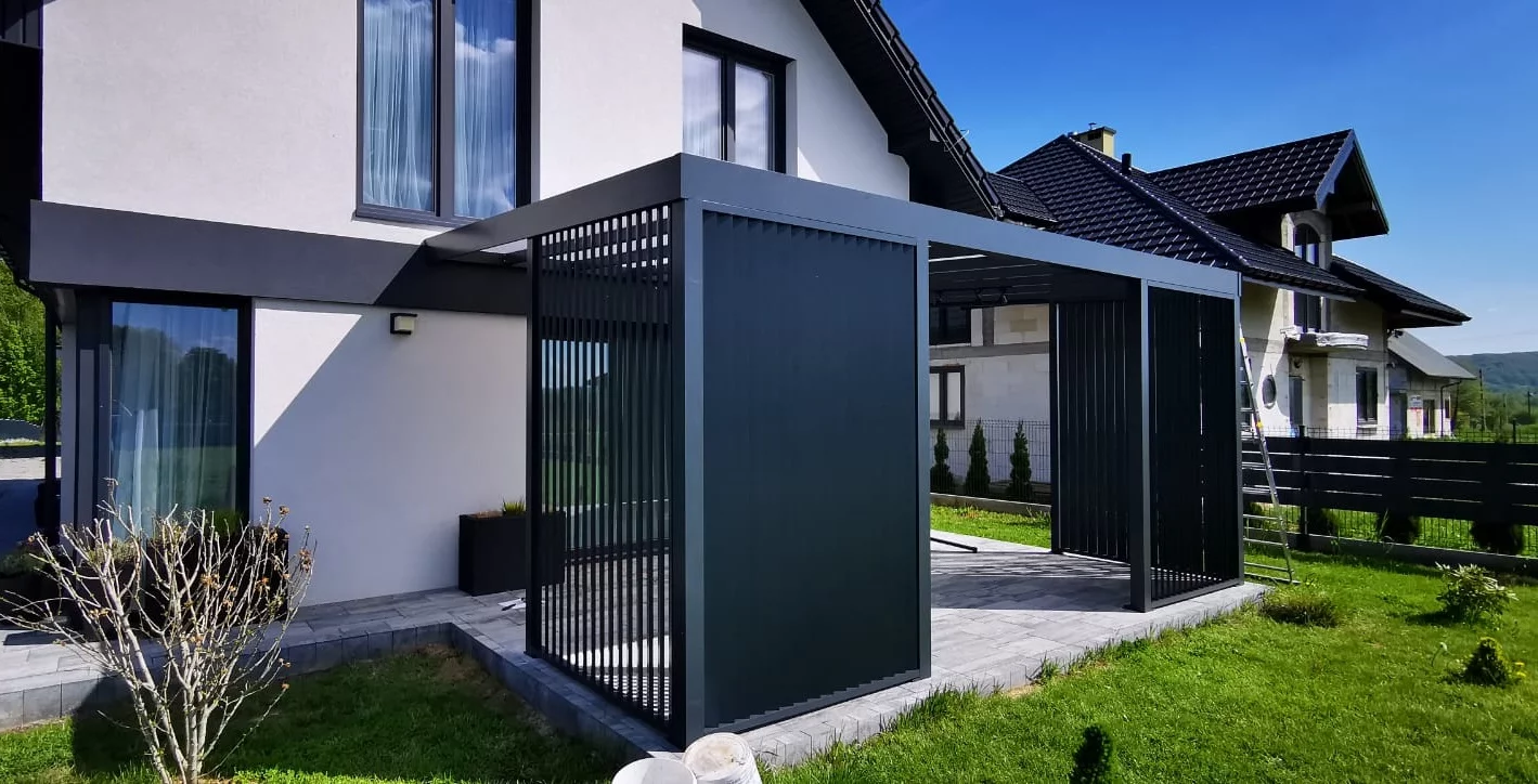 Pergole mogą być przyścienne, mocowane do ściany oraz wolnostojące. Na dachu można zamontować szkło, poliwęglan komorowy lub lity, lamele ruchome.